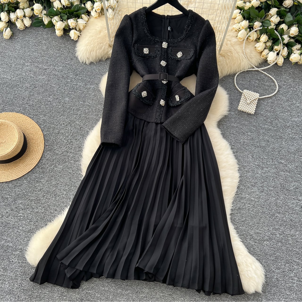 ツイード調の上身頃とプリーツスカートを組み合わせた、上品なワンピース。 クラシカルな印象の中に、柔らかな女性らしさが漂います。 【サイズ】 S: 肩幅:34cm 胸囲:88cm ウエスト:74cm 総丈:119cm 袖丈:61cm M: 肩幅:35cm 胸囲:92cm ウエスト:78cm 総丈:120cm 袖丈:62cm L: 肩幅:36cm 胸囲:96cm ウエスト:82cm 総丈:121cm 袖丈:63cm XL: 肩幅:37cm 胸囲:100cm ウエスト:86cm 総丈:122cm 袖丈:64cm 2XL:肩幅:38cm 胸囲:104cm ウエスト:90cm 総丈:123cm 袖丈:65cm ※海外製品のため、若干の誤差が生じる場合がございます。 あらかじめご了承ください。 【カラー】 ブラック 【素材】 ポリエステル 【お届けについて】 本商品は海外提携店舗より直接お届けいたします。 ご入金の確認後、おおよそ3週間前後で発送いたします。 【ご購入前にご確認ください】 ・在庫状況により、ご注文後でもキャンセルとさせていただく場合がございます。 ・海外製品のため、日本製品とは検品基準が異なります。新品未使用品でも、わずかな糸のほつれや軽微な汚れが見られる場合がございます。 ・商品の色味は、ご使用の端末やモニター環境により実際と異なる場合がございます。 ・イメージ違い・サイズ違いなど、お客様都合による返品・交換・キャンセルはお受けいたしかねます。 【ブランド公式サイト】 RANNÉ Official Site https://shop.ran-ne.com/ 【詳細ガイド】 ご購入前に必ずこちらをご覧ください。 → https://shop.ran-ne.com/about 静かに纏うような美しさを ―― RANNÉは、日常にも特別な日にも寄り添うスタイルをお届けします。