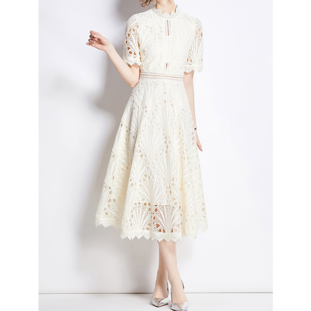 繊細なレースが描く幾何学模様が美しい、上品なミディドレス。 高めのネックラインとふんわり袖が、クラシカルな気品を添えます。 光をやわらかく反射する立体レースが、動くたびに静かな華やかさを演出。 お呼ばれにも日常の特別なひとときにも寄り添う、上品な一着です。 【サイズ】 S: 着丈109 バスト86 肩幅36 袖丈27 ウエスト66 M: 着丈110 バスト90 肩幅37 袖丈28 ウエスト70 L: 着丈111 バスト94 肩幅38 袖丈29 ウエスト74 XL: 着丈112 バスト98 肩幅39 袖丈30 ウエスト78 2XL:着丈113 バスト102 肩幅40 袖丈31 ウエスト82 ※海外製品のため、若干の誤差が生じる場合がございます。 あらかじめご了承ください。 【カラー】 アイボリー 【素材】 ポリエステル 【お届けについて】 本商品は海外提携店舗より直接お届けいたします。 ご入金の確認後、おおよそ3週間前後で発送いたします。 【ご購入前にご確認ください】 ・在庫状況により、ご注文後でもキャンセルとさせていただく場合がございます。 ・海外製品のため、日本製品とは検品基準が異なります。新品未使用品でも、わずかな糸のほつれや軽微な汚れが見られる場合がございます。 ・商品の色味は、ご使用の端末やモニター環境により実際と異なる場合がございます。 ・イメージ違い・サイズ違いなど、お客様都合による返品・交換・キャンセルはお受けいたしかねます。 【【ブランド公式サイト】 RANNÉ Official Site https://shop.ran-ne.com/ 【詳細ガイド】 ご購入前に必ずこちらをご覧ください。 → https://shop.ran-ne.com/about 静かに纏うような美しさを ―― RANNÉは、日常にも特別な日にも寄り添うスタイルをお届けします。