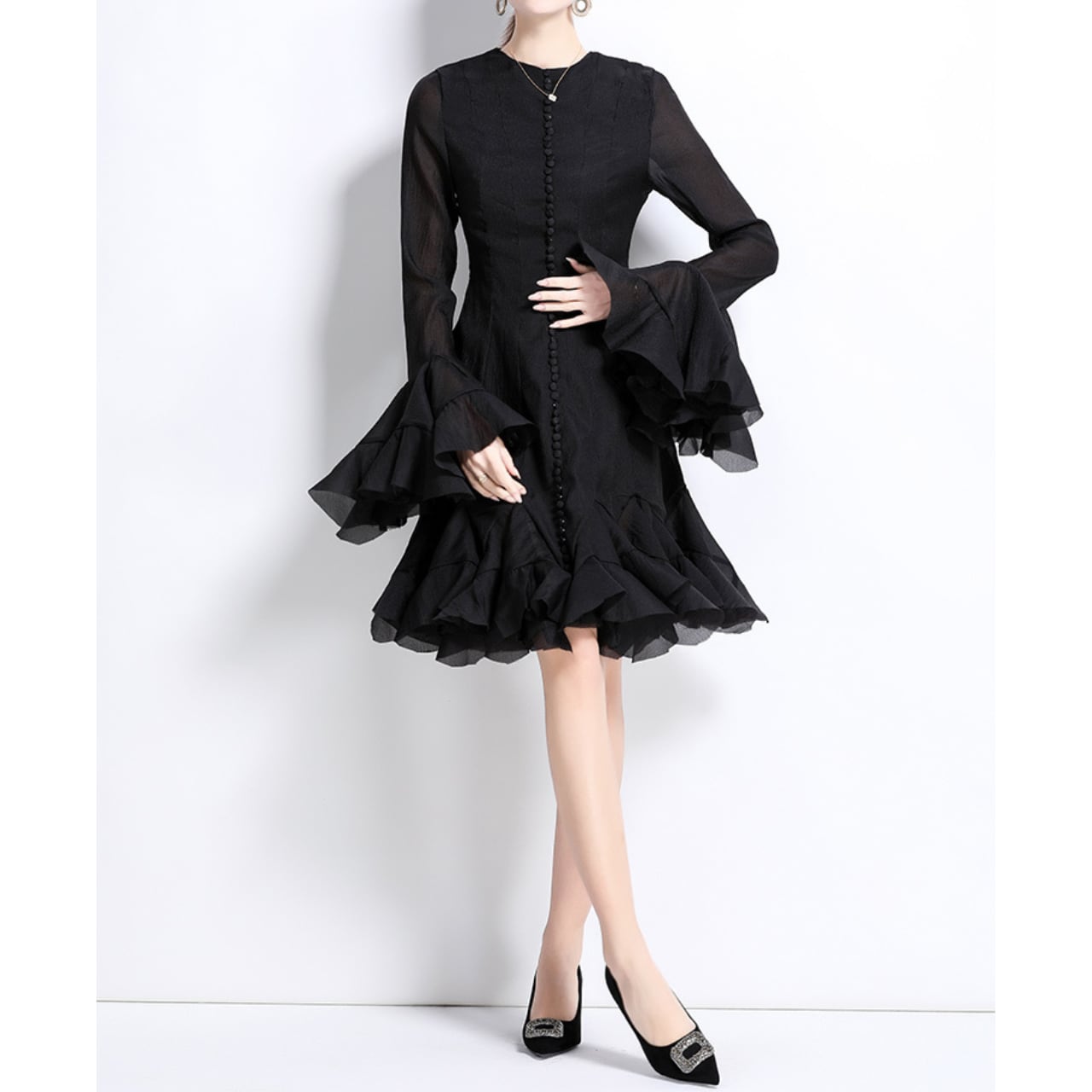 ふんわりと広がる袖と裾のフリルが印象的な、上品なブラックドレス。 透け感のあるシフォンが軽やかに揺れ、シルエット全体に凛とした美しさを漂わせます。 控えめながらも存在感のあるデザインで、ディナーやフォーマルなシーンにも映える一着。 【サイズ】 M 肩幅:36cm 胸囲:82cm ウエスト:76cm 袖丈:66cm 総丈:91cm L 肩幅:37cm 胸囲:86cm ウエスト:80cm 袖丈:67cm 総丈:92cm XL 肩幅:38cm 胸囲:90cm ウエスト:84cm 袖丈:68cm 総丈:93cm 2XL 肩幅:39cm 胸囲:94cm ウエスト:88cm 袖丈:69cm 総丈:94cm ※海外製品のため、若干の誤差が生じる場合がございます。 あらかじめご了承ください。 【カラー】 ブラック 【素材】 ポリエステル 【お届けについて】 本商品は海外提携店舗より直接お届けいたします。 ご入金の確認後、おおよそ3週間前後で発送いたします。 【ご購入前にご確認ください】 ・在庫状況により、ご注文後でもキャンセルとさせていただく場合がございます。 ・海外製品のため、日本製品とは検品基準が異なります。新品未使用品でも、わずかな糸のほつれや軽微な汚れが見られる場合がございます。 ・商品の色味は、ご使用の端末やモニター環境により実際と異なる場合がございます。 ・イメージ違い・サイズ違いなど、お客様都合による返品・交換・キャンセルはお受けいたしかねます。 【ブランド公式サイト】 RANNÉ Official Site https://shop.ran-ne.com/ 【詳細ガイド】 ご購入前に必ずこちらをご覧ください。 → https://shop.ran-ne.com/about 静かに纏うような美しさを ―― RANNÉは、日常にも特別な日にも寄り添うスタイルをお届けします。
