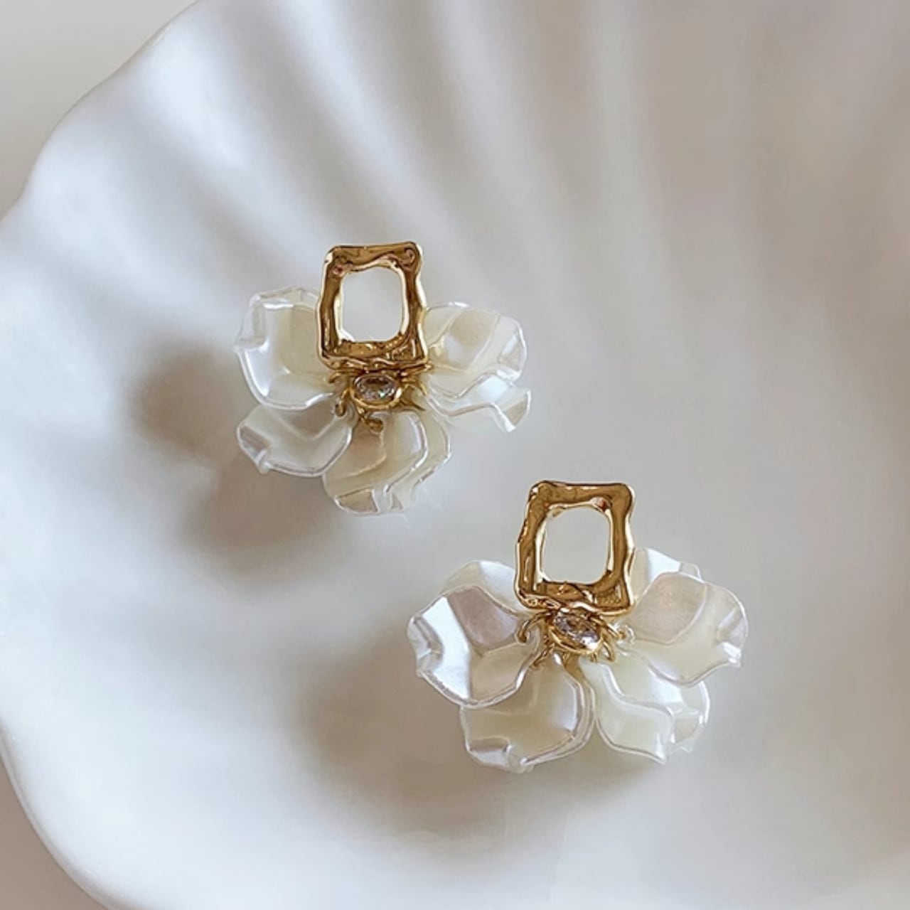 クリアフラワーとゴールドフレームが織りなす、光を受けてやさしく揺れるイヤリング。