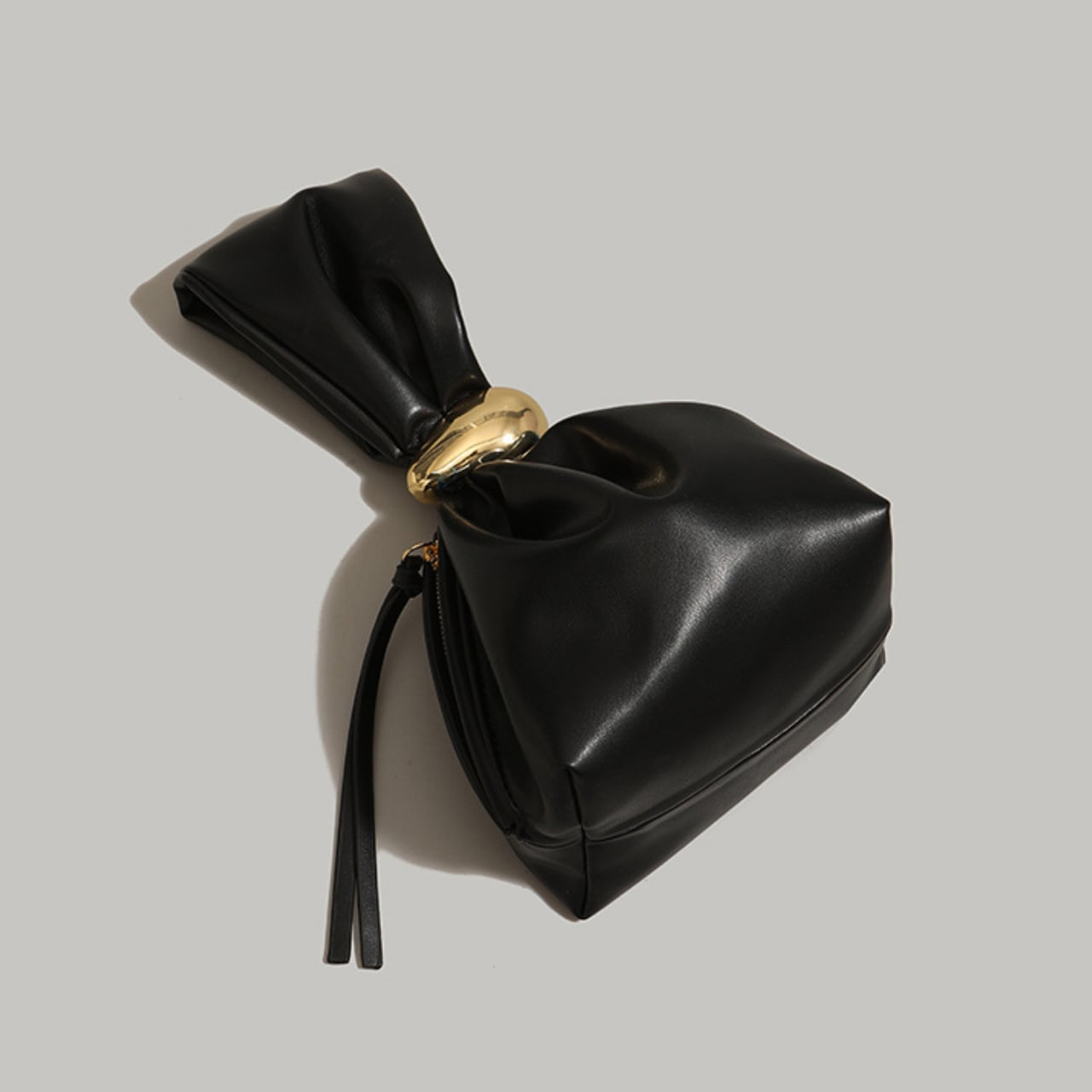 艶やかなブラックに、結びのシルエットが印象的なノットバッグ。