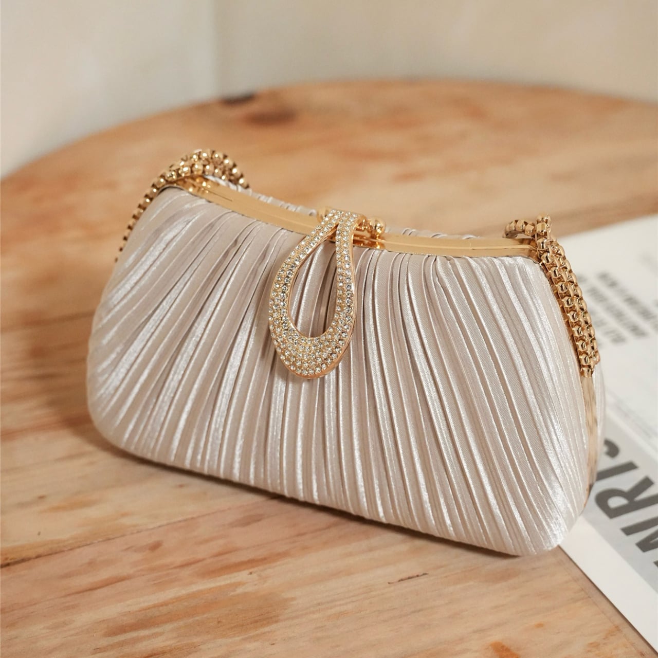 上品な光沢を纏ったプリーツ生地に、ラインストーンのバックルがきらりと輝くミニバッグ。